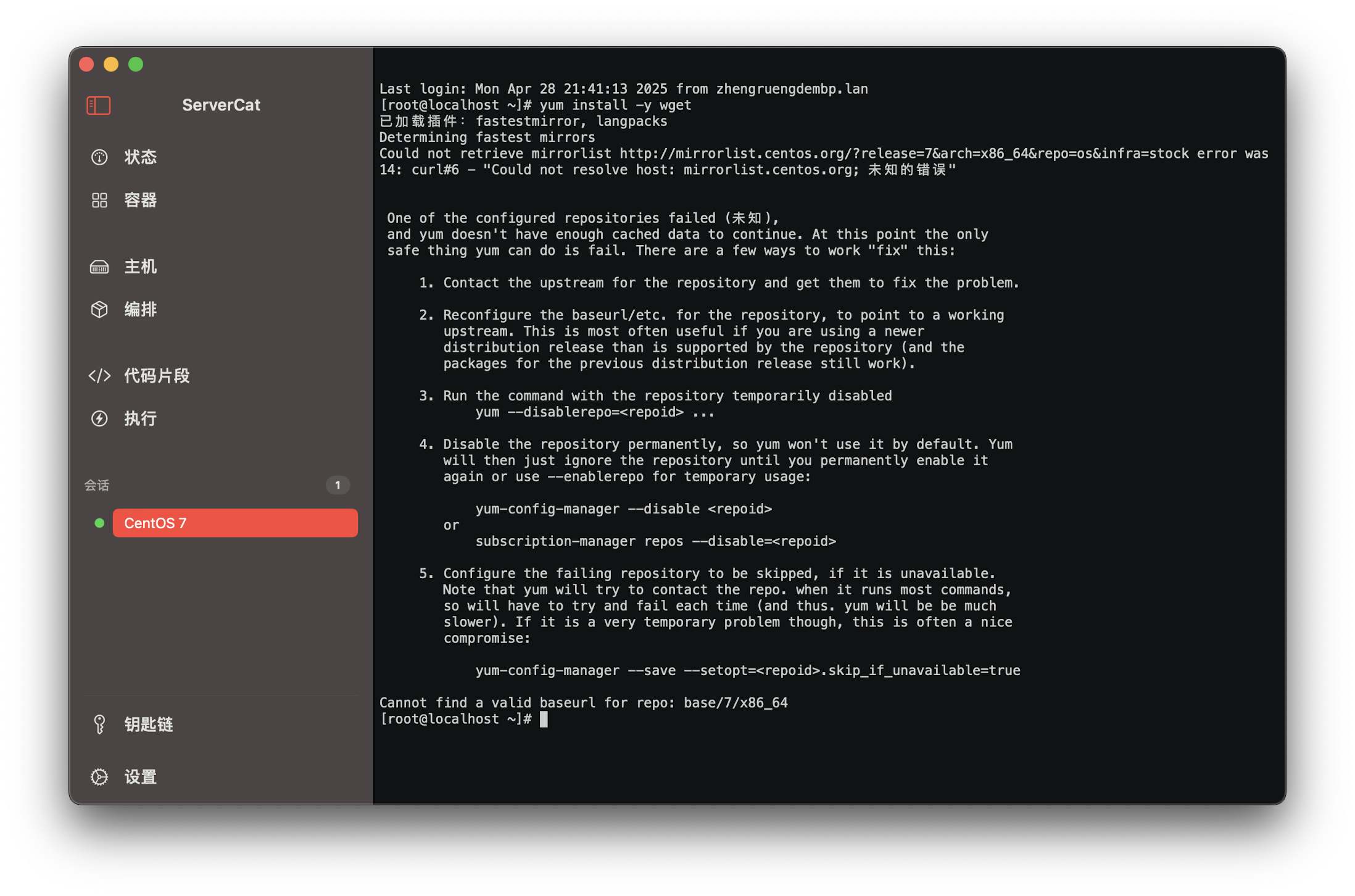如果已经排除了网络问题,那么通常是因为无法访问镜像源服务器。这种情况下,可以通过手动指定一个 CentOS 7 的镜像源来解决问题。例如: